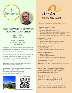 Join us for Sip into Spring as we honor 2026 Community Champion John Lynch on May 1, 2026 at Cape May Winery. An evening of wine, food, entertainment, and community in support of The Arc of Cape May County.
